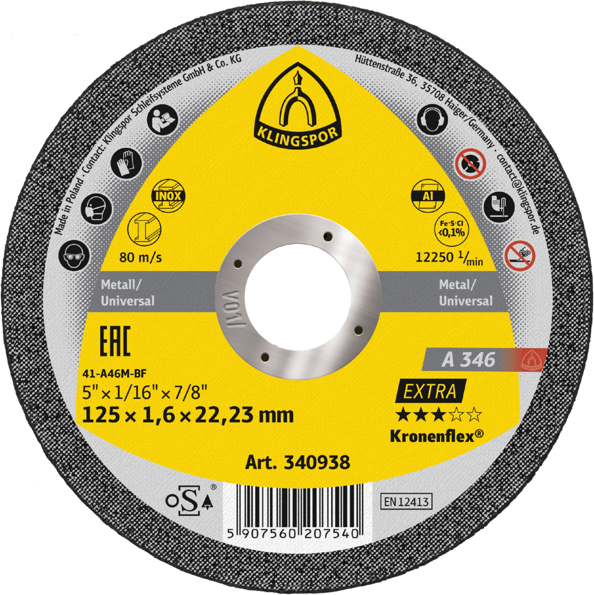 DISQUE A TRONCONNER ACIER/INOX/ALU A 346 EXTRA 125X1,6X22,23MM - Klingspor